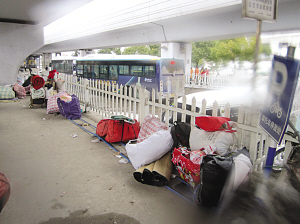 市場(chǎng)關(guān)門放假之后,那些滯留在門口的民工只好收拾好行囊,和其他工友聯(lián)系住處。一位安徽籍民工告訴記者,他和其他幾個(gè)老鄉(xiāng)準(zhǔn)備去另一個(gè)老鄉(xiāng)打工的工地那里暫時(shí)住兩天。放假了工地也停工,但是住的地方還是有的。而還有一些民工索性又將行李搬到了安德門地鐵站附近的高架橋下,“現(xiàn)在工作也不好找,住旅館實(shí)在太貴,我們只好再住回高架橋下!泵窆儼徇M(jìn)高架橋下后,個(gè)個(gè)哀聲嘆氣,但也有一些情緒樂(lè)觀的,跑進(jìn)了地鐵站內(nèi)打撲克取暖消遣。(記者 曹盧杰 裴睿)