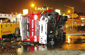 昨天(19日)下午5時(shí)15分許,(上海)浦東御橋路浦三路口處發(fā)生意外,一輛消防車與一小轎車在行駛中發(fā)生碰撞,消防車在沖倒路邊的欄桿和燈柱后側(cè)翻在地,小汽車則被反向甩出近20米遠(yuǎn),車內(nèi)一名新婚女子和一3月大的男嬰身受重傷,情勢(shì)危急,另有十余人輕傷。
