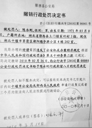 十堰市公安局網(wǎng)站,在其“十堰警訊”欄目中,發(fā)布《十堰市公安局對陳永剛誹謗他人案件作出審查復(fù)核決定》,稱鄖西縣警方拘留陳永剛一案的辦理違反了公安機(jī)關(guān)辦案程序規(guī)定。市公安局決定責(zé)令鄖西縣公安局,“依法撤銷對陳永剛行政拘留的決定;向陳永剛賠禮道歉,并依照法律規(guī)定對陳永剛予以國家賠償;根據(jù)公安部《公安機(jī)關(guān)人民警察執(zhí)法過錯責(zé)任追究規(guī)定》,嚴(yán)肅追究相關(guān)責(zé)任人的責(zé)任!