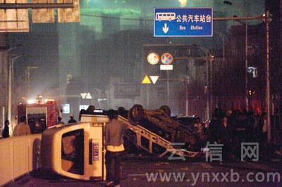 記者再次回到北倉村時,有4輛寫有“綜合執(zhí)法”及“五華城管”等字樣的車被掀翻,其中一輛在燃燒。隨后趕到的消防官兵將火撲滅。