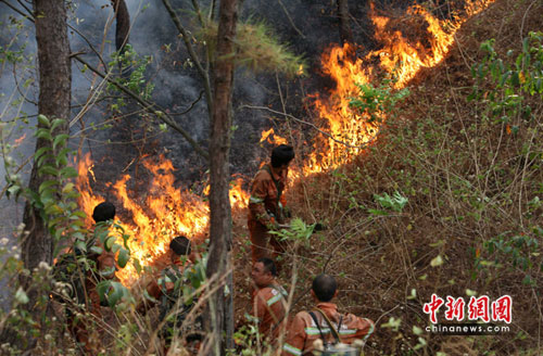 據(jù)當(dāng)?shù)卮迕窠榻B,大火是凌晨3:00左右從山梁處頂開始燃起,大火迅速蔓延開。火災(zāi)發(fā)生后,當(dāng)?shù)厝罕姄艽蛄嘶鹁娫挘捎谄鸹瘘c位于山頂,加上天未亮,給撲火工作帶來很大難度,趕到現(xiàn)場的攀枝花市仁和區(qū)地方森林撲火隊及森林武警60余人摸黑奮戰(zhàn),8:00左右,山火被成功控制。但由于當(dāng)?shù)匾延?87天無降雨過程,山上草木十分干燥。16時許,火星再次復(fù)燃引發(fā)山火,過火面積超過上百公頃。記者在現(xiàn)場看到,高高的大山,經(jīng)山火一燒后地面被披上了一層黑色的外衣,顯得十分猙獰。