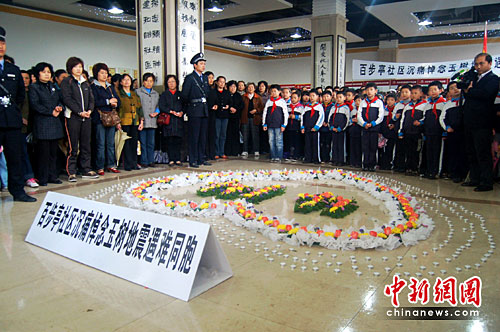 上午10時,數(shù)百名武漢百步亭居民、育才小學(xué)學(xué)生代表有序來到社區(qū)活動中心。在工作人員的引導(dǎo)下,他們靜靜地圍繞著用鮮花扎成的“4.14之心”分排站好,手捧蠟燭,向遇難同胞默哀;顒蝇F(xiàn)場,居民自發(fā)手折紙鶴,以此寄托對災(zāi)區(qū)民眾的牽掛與祝愿。