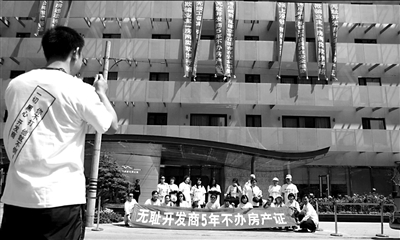 昨天上午,數(shù)十業(yè)主統(tǒng)一著裝聚在公寓大門前,并在樓前掛出橫幅,聲討開發(fā)商不給房產(chǎn)證等惡劣行徑。多名業(yè)主表示,他們是近幾年來陸續(xù)入住該公寓的,但都未獲得房產(chǎn)證,拉橫幅集體抗議實屬無奈。記者多次聯(lián)系開發(fā)商一方,均被告知不便回答或拒絕采訪。