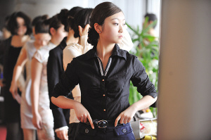 候場區(qū),美女云集的地方,只要一個轉(zhuǎn)身,你就可以看見近千名佳麗有的在偷偷補妝,有的對著鏡子練習(xí)微笑。在等候面試的美女中,有帶著綠色美瞳的美國加州留學(xué)生,有穿背帶褲剛剛高中畢業(yè)的學(xué)生,還有身著職業(yè)裝想換個工作的公司白領(lǐng)!艾F(xiàn)在工作不好找,所以只要有招聘就來試試咯!边@是記者在現(xiàn)場聽到最多的一句話。