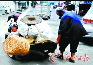 在穿梭的車流中,陳老伯弓著腰,吃力地拉著歪歪扭扭的平板車在大馬路上緩慢前行,車輛在他身邊飛馳而過,老人究竟要去哪里呀?“我要拉去清新縣逕口,要走3個小時啊,”從老伯含糊不清的言語中,記者得知,原來這對年齡加起來160歲的老夫妻每天凌晨3時多就要起身,從20多公里外的城郊拉車徒步進城,到了市場已經(jīng)天亮,接著他們分頭去揀一些爛菜葉等裝好車,再一路拉回去喂豬,到了家里已是月上梢頭。一個8旬老伯拉著平板車從松崗市場去清新逕口,就算是一個正常人行路,也要走幾個小時,別說是拉車了。陳伯的舉動吸引了不少人的好奇的目光,他為何要這樣折磨自己啊?