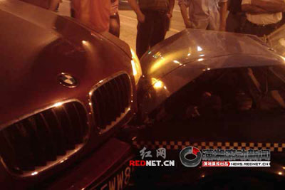 5月31日晚9時(shí)左右,長(zhǎng)沙市韶山南路砂子塘路段發(fā)生一起車禍,一輛寶馬越野車在拐彎時(shí)走錯(cuò)車道,逆行與一輛等紅燈的的士相撞后,推著的士前進(jìn)了近20米,導(dǎo)致包括的士車在內(nèi)的5車連環(huán)追尾。