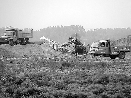 耕地已被毀,機(jī)械穿梭忙,振動(dòng)篩正在向車上裝沙