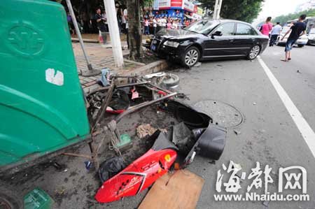 目擊者鄭小姐說,當(dāng)時(shí)她騎著電動(dòng)車,在豪華轎車后面,與其同向行駛。豪華轎車先刮碰到一名騎自行車的女子,接著,非機(jī)動(dòng)車道上一名騎摩托的男子和一名騎電動(dòng)車的男子被撞飛,高度超越小車車頂,又重重摔到了人行道上。附近商家則說,豪華車是為躲避騎自行車的女子,打方向盤向右避讓,隨即撞上兩名騎車的男子。“如果沒這棵樹就慘了,可能更多人被撞!备呦壬男≤嚠(dāng)時(shí)就停在事發(fā)地附近等朋友。他說,他先是聽到一聲刺耳的剎車聲音,循聲看去,看到兩名騎車男子被撞飛。另有目擊者說,豪華車撞人后繼續(xù)往前沖,撞倒路邊的電話亭,再撞上行道樹后才停下。受傷的三人中,一人昏迷不醒,滿身是血。豪華車司機(jī)沒有受傷。