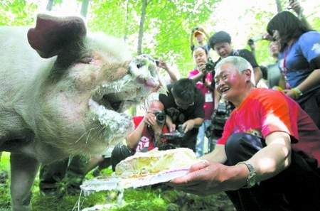 王福清、萬(wàn)興明和劉大會(huì)只好將蛋糕拿到樹林里去!柏i堅(jiān)強(qiáng)”嗅了嗅從來(lái)沒有吃過的蛋糕,張開大嘴吃起來(lái)。人們爭(zhēng)相去看,為它拍照,“豬堅(jiān)強(qiáng)”被圍得嚴(yán)嚴(yán)實(shí)實(shí)。王福清還給它臉上抹上了奶油。