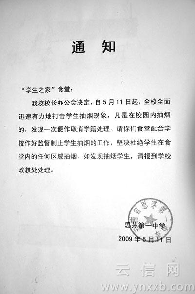 2010年6月1日,普洱市思茅區(qū)教育局向區(qū)屬23所校園發(fā)出《思茅區(qū)教育局關(guān)于在校園內(nèi)公共場(chǎng)所禁煙的通知》(以下簡(jiǎn)稱(chēng)《通知》)!斑@是云南省第一家自發(fā)進(jìn)行控?zé)煿ぷ鞯慕逃龁挝!痹颇鲜〗】到逃責(zé)熮k公室主任趙白帆說(shuō)。