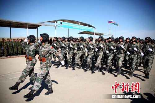 9月24日,“和平使命-2010”上海合作組織成員國(guó)武裝力量聯(lián)合反恐軍事演習(xí)戰(zhàn)役實(shí)施階段實(shí)兵演練,演練在哈薩克斯坦南部馬特布拉克訓(xùn)練場(chǎng)正式舉行。當(dāng)天下午在野戰(zhàn)兵營(yíng)為聯(lián)演中表現(xiàn)優(yōu)異的各方軍官和士兵代表舉行頒獎(jiǎng)儀式,圖為中方參演部隊(duì)官兵分列式走過儀式主席臺(tái)。