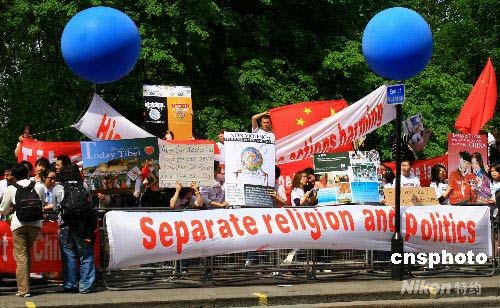 當(dāng)?shù)貢r(shí)間5月22日下午,中國(guó)留學(xué)生和華人青年在英國(guó)皇家阿爾伯特廳外舉行示威,抗議達(dá)賴(lài)?yán)锿崆鞑卣嫦,呼吁西方民眾要了解真?shí)的西藏。中新社發(fā) 李鵬 攝