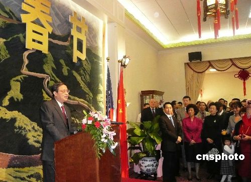 中國駐美大使周文重于當?shù)貢r間17日晚在駐美使館華僑華人春節(jié)招待會上致辭時表示,展望處于復(fù)雜而深刻變化的二00九年,中美都面臨機遇和挑戰(zhàn),中方愿與美方一道推動中美關(guān)系穩(wěn)步發(fā)展。當晚的招待會共有七百多名來自一百六十多個僑社的華僑華人出席。中新社發(fā) 覃展鵬 攝
