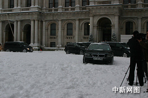 當(dāng)?shù)貢r間二月二日上午八時三十分許,中國總理溫家寶在英國倫敦出席布朗首相舉行的歡迎儀式。圖為溫家寶的座車駛?cè)胗饨徊績?nèi)庭院歡迎儀式現(xiàn)場。前夜,倫敦突然迎來近十七年最大的一場降雪,整座城市被白雪覆蓋。中新社記者 張朔 攝