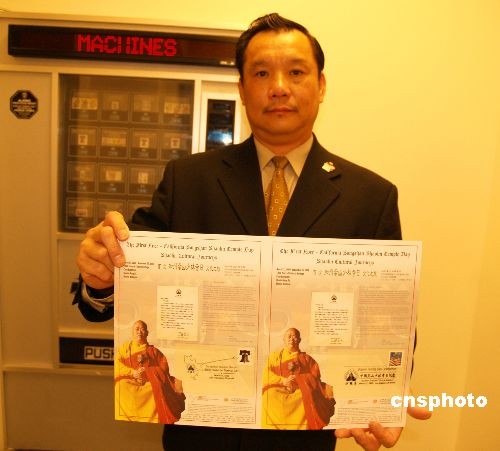 3月26日,中美集郵中心主任魏進(jìn)發(fā)在洛杉磯展示以少林寺為圖記的紀(jì)念郵戳。美國加州郵局為慶!爸袊陨缴倭炙氯铡保夭捎弥忻兰]中心設(shè)計的首日封圖案,分別為舊金山地區(qū)和洛杉磯地區(qū)刻制了2枚圖案不同的精美郵戳,這是目前在中國境外唯一的以少林寺為圖記的紀(jì)念郵戳,這2款紀(jì)念郵戳將被美國郵政博物館收藏。中新社發(fā) 盧威 攝