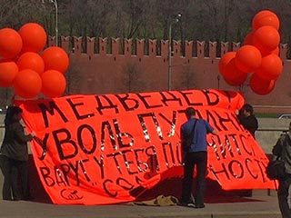 據(jù)俄羅斯新聞網(wǎng)報(bào)道,俄羅斯反對(duì)黨“團(tuán)結(jié)運(yùn)動(dòng)”組織成員4月28日在克里姆林宮前舉行了聲勢(shì)浩大的反政府游行活動(dòng)。期間,3名“團(tuán)結(jié)運(yùn)動(dòng)”的積極分子在克里姆林宮附近的河岸邊懸掛紅色的巨型橫幅,上面印有:“梅德維杰夫,辭去普京總理職務(wù)!弊謽,橫幅兩邊系有紅色的氣球,橫幅下部印有“團(tuán)結(jié)運(yùn)動(dòng)”組織的徽標(biāo)。