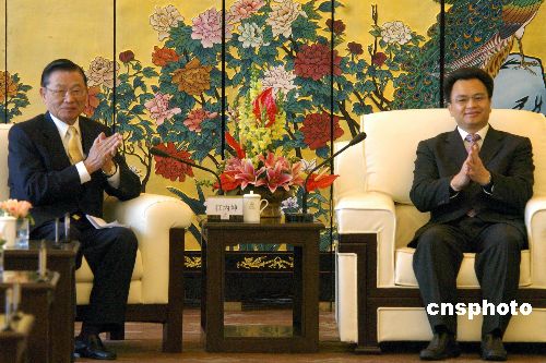 一月九日中午,廣州花園酒店,廣東省副省長萬慶良會見臺灣;鶗麻L江丙坤及海協(xié)會與海基會聯(lián)合參訪團一行。中新社發(fā) 柯小軍 攝