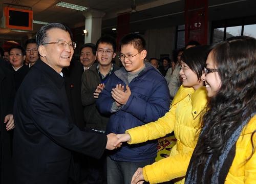 2月15日晚,正在天津調(diào)查研究的中共中央政治局常委、國(guó)務(wù)院總理溫家寶來到南開大學(xué)親切看望大學(xué)生。他勉勵(lì)同學(xué)們要心系國(guó)家,努力學(xué)習(xí),甘于奉獻(xiàn),樹立正確的擇業(yè)觀念。 新華社記者 李學(xué)仁 攝