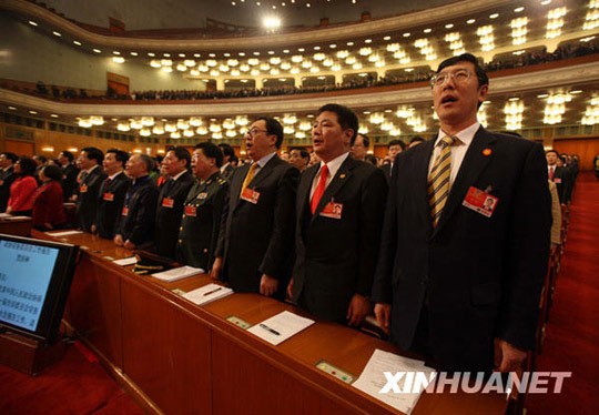 3月3日,中國(guó)人民政治協(xié)商會(huì)議第十一屆全國(guó)委員會(huì)第二次會(huì)議在北京人民大會(huì)堂開(kāi)幕,全場(chǎng)齊唱國(guó)歌。