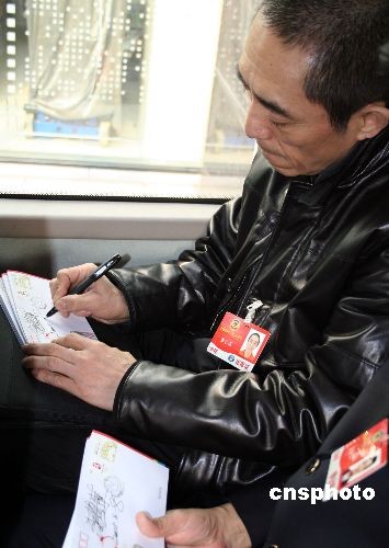 圖:張藝謀前往政協(xié)開幕大會路上忙簽名——中新網(wǎng)