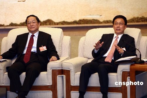3月7日,全國人大上海代表團在人民大會堂舉行全體會議。上海市委書記俞正聲(左)、市長韓正出席會議。韓正在接受采訪時表示,已向國務(wù)院提交在上海成立人民幣結(jié)算試點申請,希望能盡快推進。中新社發(fā) 杜洋 攝