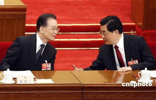 3月10日,十一屆全國人大二次會(huì)議舉行第三次全體會(huì)議,最高人民法院院長王勝俊、最高人民檢察院檢察長曹建明分別作工作報(bào)告。圖為國家主席胡錦濤與國務(wù)院總理溫家寶在會(huì)議開始前交談。中新社發(fā) 盛佳鵬 攝