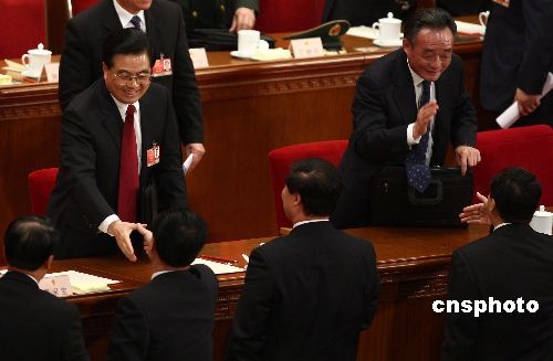 3月10日,中國國家主席胡錦濤、全國人大常委會委員長吳邦國在第十一屆全國人民代表大會第二次會議第三次全體會議結束后和代表握手。中新社發(fā) 杜洋 攝