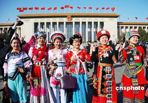 3月13日,一群少數(shù)民族全國人大代表參加“兩會(huì)”閉幕會(huì)后揮手告別,相約明年“兩會(huì)”再見。中新社發(fā) 韓海冰 攝