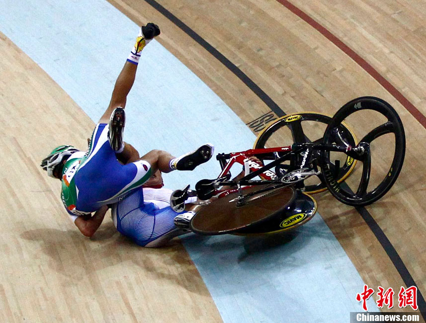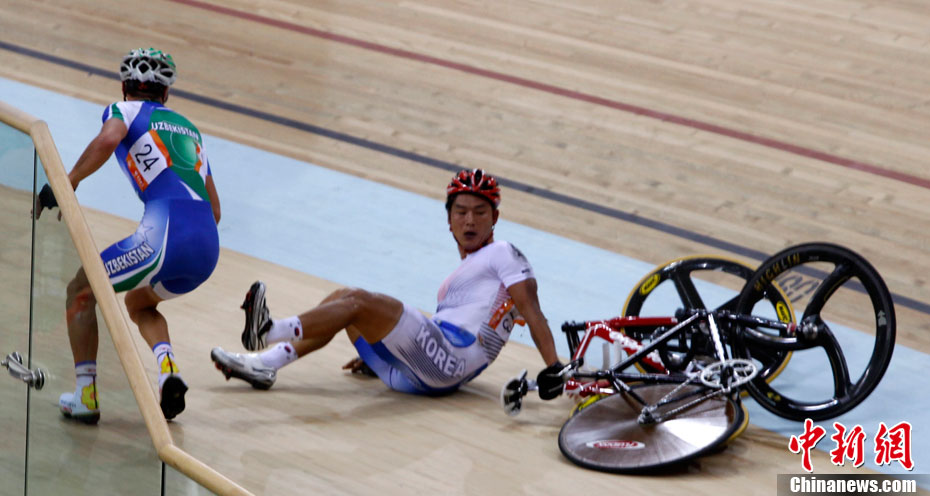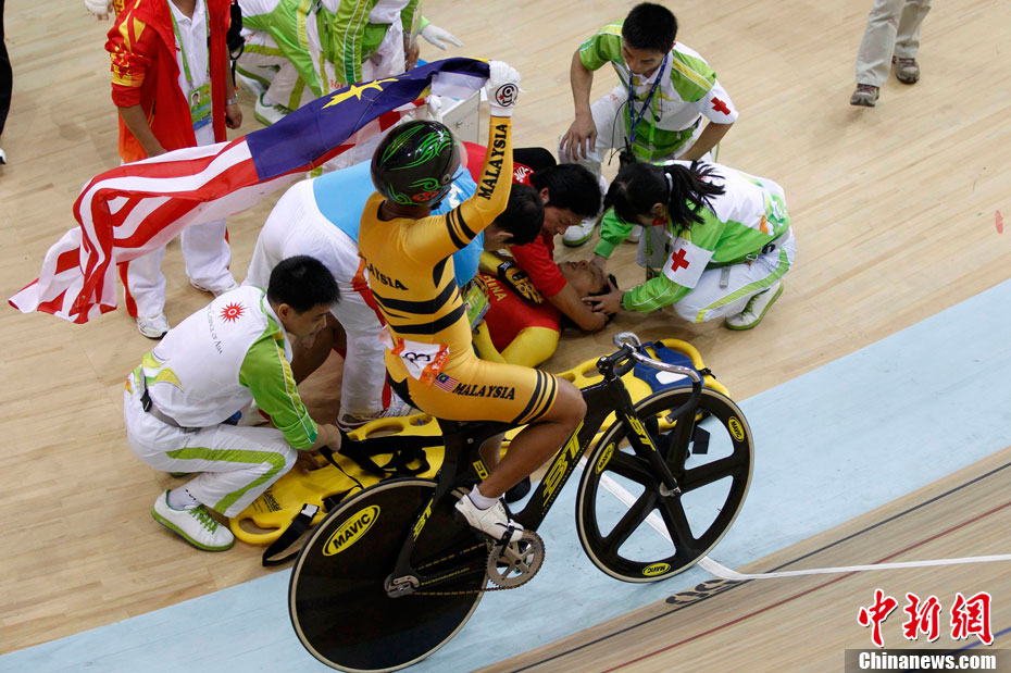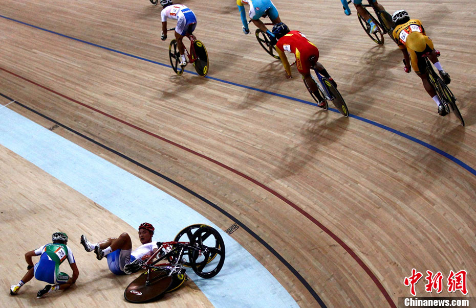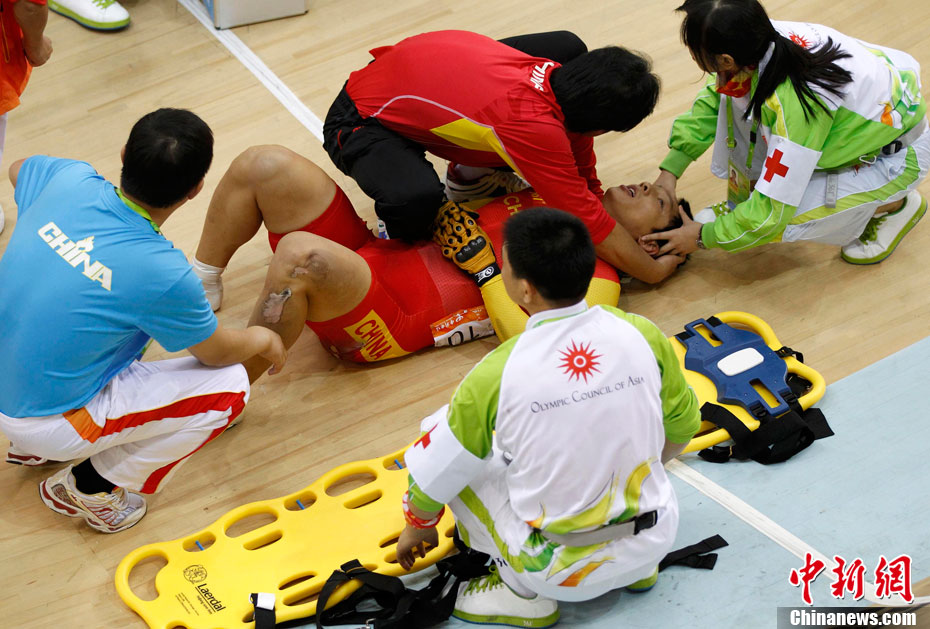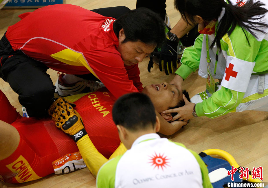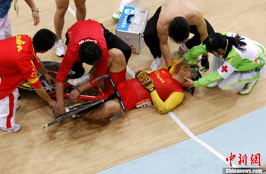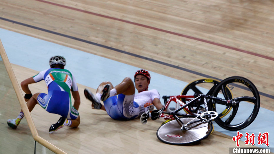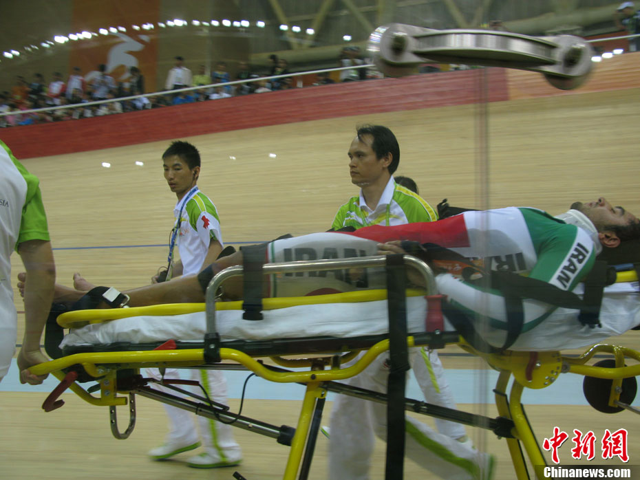 11月17日進(jìn)行的男子場地自行車凱琳賽中再次發(fā)生意外,在比賽最后一圈中,中國選手張磊和伊朗選手帕拉什-默哈默德發(fā)生碰撞,雙雙退出比賽,后者因?yàn)閭麆輫?yán)重已經(jīng)被送往賽會(huì)指定醫(yī)院進(jìn)行治療。