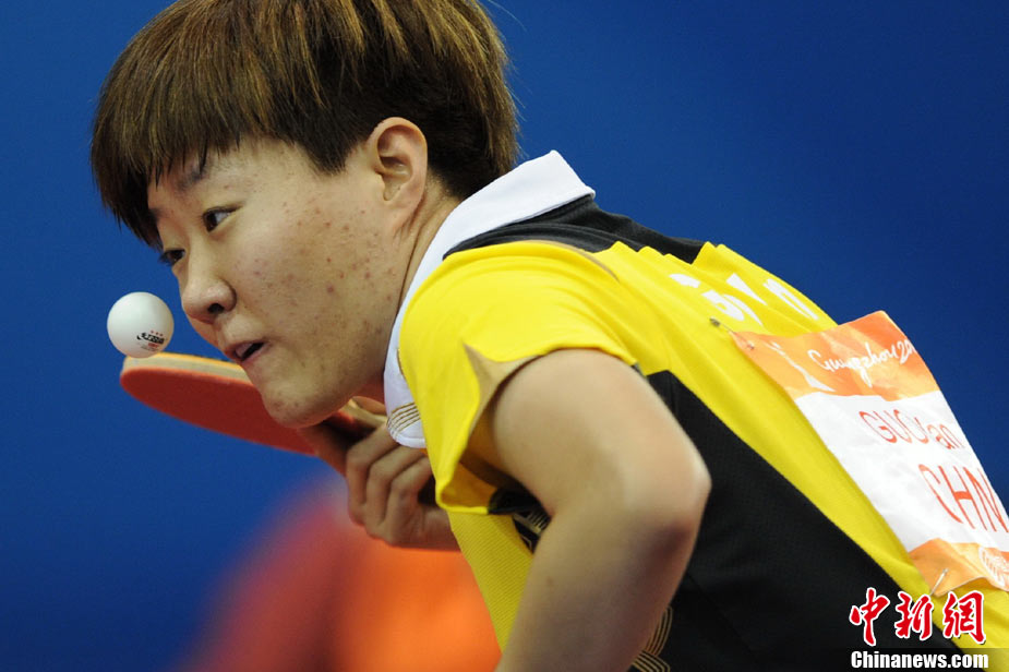 第16屆亞運(yùn)會(huì)正在廣州酣戰(zhàn),精彩亞運(yùn)體現(xiàn)在賽場(chǎng)內(nèi)外。中國(guó)乒乓軍團(tuán)一舉拿下亞運(yùn)女子團(tuán)體、男子團(tuán)體金牌,賽場(chǎng)上留下了乒乓健兒的運(yùn)動(dòng)風(fēng)采---乒乓球的魅力。圖為乒乓名將馬琳賽場(chǎng)風(fēng)采。中新社記者 陳文 攝
