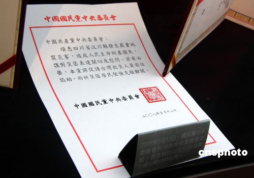 正在臺北中國國民黨中央黨部黨史展覽廳舉辦的“跨越三世紀(jì)——中國國民黨的變與不變”展覽,展出許多珍貴史料。圖為2008年5月12日,中國國民黨中央委員會(huì)就汶川大地震向中國共產(chǎn)黨中央委員會(huì)發(fā)出的電函。中新社發(fā) 陳立宇 攝