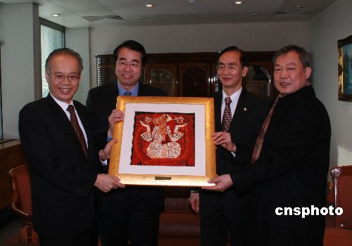 當(dāng)?shù)貢r間1月31日,正在倫敦訪問的中國國務(wù)院僑辦副主任許又聲前往臺資長榮集團(tuán)英國總部參觀訪問,與長榮集團(tuán)高層會晤。圖為許又聲(左二)向長榮集團(tuán)贈送禮品。中新社發(fā) 李鵬 攝