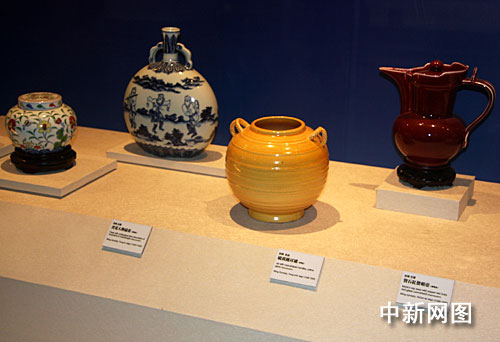 近日,為推廣臺(tái)北故宮“周末夜”活動(dòng),臺(tái)北故宮博物院在臺(tái)北火車站設(shè)置長(zhǎng)箱型玻璃廣告廊,以高仿真度的館藏文物進(jìn)行宣介。圖為展示的仿明代前期官營作坊的瓷器。 中新社記者 陳立宇 攝
