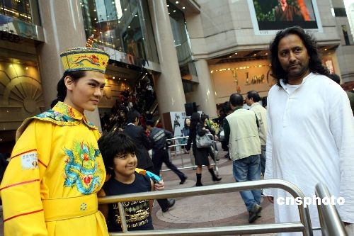 二月十九日,“香港電影百年展”在時(shí)代廣場(chǎng)舉行,展覽內(nèi)容包括香港電影業(yè)百年間的發(fā)展歷史、早期的電影海報(bào)、明星相及廣告。圖為古裝扮相的演員與游客同樂。中新社發(fā) 洪少葵 攝