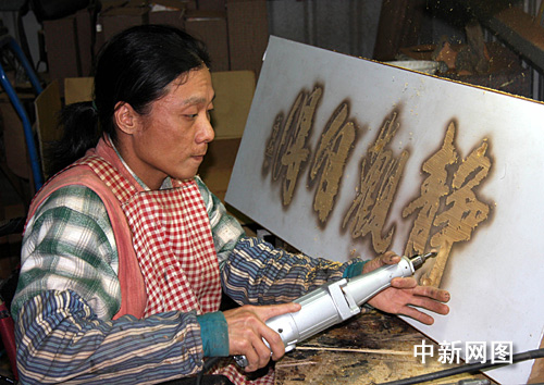 面對(duì)罕見(jiàn)金融危機(jī)沖擊引發(fā)的失業(yè)潮。身有殘障的臺(tái)灣知名木雕家林正發(fā)并沒(méi)氣餒,而是自食其力。圖為林正發(fā)正在自己的工作室中制作承接的牌匾,掙錢(qián)糊口。陳立宇 攝