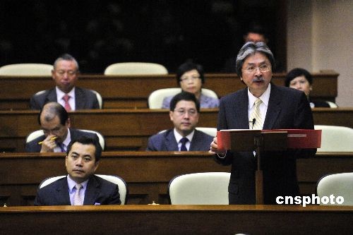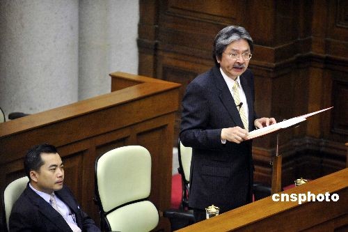 二月二十五日,香港特區(qū)財(cái)政司司長曾俊華在立法會(huì)大樓會(huì)議廳向立法會(huì)提交二零零九至二零一零年度財(cái)政預(yù)算案。中新社發(fā) 譚達(dá)明 攝