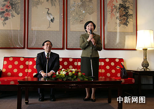 2月26日,上海博物館館長陳燮君一行應(yīng)邀抵達(dá)臺北參訪。圖為今天中午,臺北故宮博物院院長周功鑫(右一)在臺北圓山飯店歡迎陳燮君(左一)一行。 中新社記者 陳立宇 攝