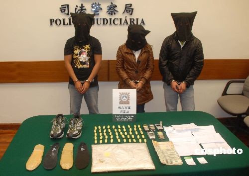 澳門警方三月八日、九日連破三起跨國販毒案,在澳門國際機(jī)場(chǎng)抓獲三名菲律賓籍毒販,他們分別通過體內(nèi)藏毒及行李、鞋子夾帶等方式帶入的海洛因二千九百克。中新社發(fā) 畢永光 攝