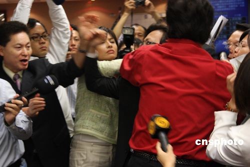 四月二十二日上午,臺灣“立法院內(nèi)政委員會”邀請“陸委會”主委賴幸媛、海基會秘書長高孔廉等人報告即將舉行的第三次“陳江會談”。據(jù)臺灣中央社報道:中國國民黨籍“立委”李慶華在進行程序發(fā)言時,民進黨籍“立委”邱議瑩在臺下表達不滿意見,引發(fā)李慶華不滿,要邱議瑩“有點家教”,邱議瑩(左四穿白衣女性)與李慶華(穿紅衣男性)爆發(fā)口角,并突然從后面打李慶華一巴掌。李慶華下午到臺北地檢署,按鈴控告邱議瑩傷害及公然侮辱罪。圖為本社記者在“立法院”采訪時拍攝到的情景。中新社發(fā) 耿軍 攝