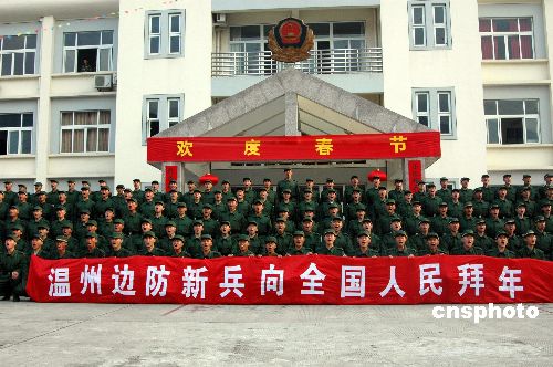 1月24日,駐守在東海之濱的浙江溫州邊防支隊(duì)全體新戰(zhàn)士在第二故鄉(xiāng)向全國(guó)人民拜年,祝祖國(guó)繁榮昌盛,祝人民新春快樂(lè)!中新社發(fā) 吳水斌 攝