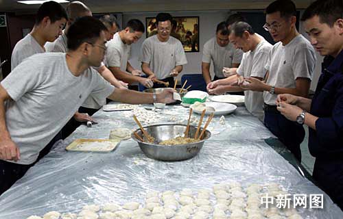 “海口”號(hào)導(dǎo)彈驅(qū)逐艦官兵包餃子過(guò)新年。中新社記者 孫自法 攝