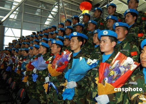 2月16日下午,中國第五批赴蘇丹維和部隊(duì)第一梯隊(duì)出征儀式在河南省鄭州市新鄭國際機(jī)場(chǎng)舉行。中國第五批赴蘇丹維和部隊(duì)共由375名官兵組成,包括一支工兵大隊(duì),一支運(yùn)輸大隊(duì)和一支醫(yī)療分隊(duì)。此次出征的第一梯隊(duì)共105人,包括工兵大隊(duì)40人,運(yùn)輸大隊(duì)30人,醫(yī)療分隊(duì)35人。他們將于當(dāng)?shù)貢r(shí)間17日10時(shí)左右到達(dá)蘇丹歐拜伊德,隨后轉(zhuǎn)乘聯(lián)合國包機(jī)飛赴瓦烏任務(wù)區(qū)。其余維和人員將于本月陸續(xù)抵達(dá)任務(wù)區(qū)。 中新社發(fā) 李亮 攝