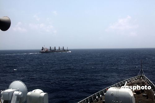 2009年4月11日,中國海軍首批護(hù)航編隊(duì)在亞丁灣開始執(zhí)行第40批商船護(hù)航任務(wù),“?凇碧(hào)導(dǎo)彈驅(qū)逐艦單獨(dú)伴隨護(hù)航一艘晚到的香港商船“明達(dá)”號(hào),從曼德海峽東口朝亞丁灣東部海域進(jìn)發(fā)。當(dāng)天早些時(shí)候,“武漢”艦已伴隨護(hù)航5艘商船先行。中新社發(fā) 孫自法 攝