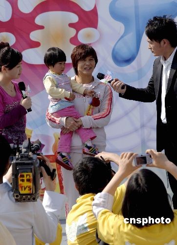 三月十五日,由南方電視臺(tái)少兒頻道主辦的“第三屆長安寶寶大賽”啟動(dòng)儀式在廣東東莞東城文化中心舉行。奧運(yùn)冠軍冼東妹與她的女兒參加比賽后接受媒體采訪。中新社發(fā) 劉衛(wèi)勇 攝