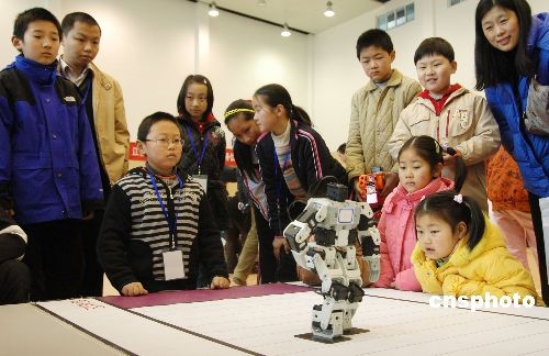 2009年3月29日,2009年“VEX”杯蘇州市青少年機(jī)器人比賽在蘇州善耕實(shí)驗(yàn)小學(xué)開幕,來自蘇州敬文實(shí)驗(yàn)小學(xué)及其周邊縣市的77所中小學(xué)校的467位選手參賽,參賽者分別進(jìn)行了機(jī)器人“踢足球”、“滅火”和“基本技能”等八個(gè)項(xiàng)目的角逐,場面十分熱鬧。中新社發(fā) 蘇民 攝