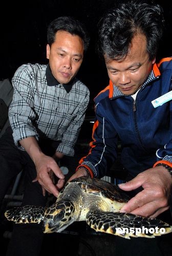 4月13日,福州一漁民將其幾天前在海邊偶然發(fā)現(xiàn)的“玳!焙}斔瓦M(jìn)福州左海海底世界。這只“玳瑁”長(zhǎng)約12厘米,重約1750克,嘴如鷹嘴,甲殼為褐色,頜緣鋸齒狀。據(jù)飼養(yǎng)員介紹,這只小海龜大約才2歲,還屬于“嬰兒”狀態(tài)!扮殍!庇址Q(chēng)十三鱗,屬于國(guó)家二級(jí)保護(hù)動(dòng)物,一般壽命可達(dá)1500歲,成年的玳瑁(約20多歲)身長(zhǎng)1米,體重40~60公斤,主要生長(zhǎng)于熱帶及亞熱帶地區(qū)的暖水性海洋。該類(lèi)海龜在中國(guó)主要分布于臺(tái)灣、福建和海南等沿海一帶海域。 中新社發(fā) 穆長(zhǎng)梓 攝
