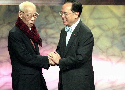 四月二十一日,香港特區(qū)行政長官曾蔭權(quán)為最高榮譽(yù)“終身成就獎(jiǎng)”得主國學(xué)大師兼漢學(xué)家饒宗頤教授頒獎(jiǎng)祝賀。當(dāng)日,“2008香港藝術(shù)發(fā)展獎(jiǎng)”頒獎(jiǎng)禮在香港大會(huì)堂舉行,頒發(fā)了三十一個(gè)獎(jiǎng)項(xiàng)予本地藝術(shù)工作者、團(tuán)體、學(xué)校及商業(yè)機(jī)構(gòu),以表揚(yáng)他們?cè)谒囆g(shù)方面的成就。中新社發(fā) 張勤 攝