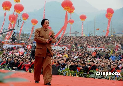 12月31日,扮演“毛主席”的川劇著名演員登臺看望四川地震極重災(zāi)區(qū)的北川縣擂鼓鎮(zhèn)災(zāi)區(qū)民眾。北川受災(zāi)的上萬民眾在此團(tuán)聚,以迎元旦文藝表演告別難忘的2008年。中新社發(fā) 賈國榮 攝