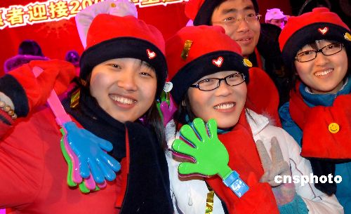 北京:2009年元旦零時到來時刻,北京600多名志愿者及社會名流在鐘鼓樓廣場聚會,參加北京志愿者協會等部門共同舉辦的“微笑北京,和諧先鋒”主題活動,并狂歡慶新年到來。此活動是600名志愿者和社會名流參會。北京奧運會期間,10萬賽會志愿者、100萬社會志愿者、40萬城市志愿者和20萬拉拉隊志愿者在各類服務領域累計服務超過2億小時!≈行律绨l(fā) 鄒憲 攝