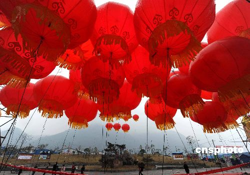 2009年元旦節(jié),四川大地震極重災區(qū)的北川縣擂鼓鎮(zhèn)板房區(qū)廣場大紅燈籠高高掛,為災民生活增添色彩。中新社發(fā) 賈國榮 攝